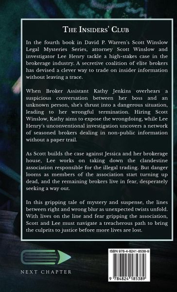 In the fourth book in David P. Warren's Scott Winslow Legal Mysteries Series, attorney Scott Winslow and investigator Lee Henry tackle a high-stakes case in the brokerage industry. A secretive coalition of elite brokers has devised a clever way to trade on insider information without leaving a trace. When Broker Assistant Kathy Jenkins overhears a suspicious conversation between her boss and an unknown person, she's thrust into a dangerous situation, leading to her wrongful termination. Hiring Scott Winslow, Kathy aims to expose the wrongdoing, while Lee Henry's unconventional investigation uncovers a network of seasoned brokers dealing in non-public information without a paper trail. As Scott builds the case against Jessica and her brokerage house, Lee works on taking down the clandestine association responsible for the illegal trading. But danger looms as members of the association start turning up dead, and the remaining brokers live in fear, desperately seeking a way out. In this gripping tale of mystery and suspense, the lines between right and wrong blur as unexpected twists unfold. With lives on the line and fear gripping the association, Scott and Lee must navigate a treacherous path to bring the culprits to justice before more lives are lost.
