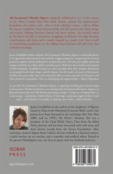The Insomniac's Weather Report, originally published in 2011 as the winner of the Three Candles Press First Book Award, explores the impermanent boundaries that define and - due to their nebulous nature - fail to define the human condition: those between body and self, parent and child, energy and matter. Shifting between formal and prose poems, the myriad voices in this book include an insomniac struggling to delineate the edge between consciousness and sleep, and a couple trapped in a poem cycle that is itself an interlocking meditation on the oblique lines between self and other that constitute marriage. "Jessica Goodfellow's debut collection The Insomniac's Weather Report is admirably diverse in its approaches and structures and reads like 'a fugue of opposites', integrating the scientist's persistent enquiry and the philosopher's rarefied obsessions with this poet's highly tuned and unique sensibility 'in a blaze of form and discontent'. With their keen intellect and capacity to hold ambiguity, Goodfellow's poems are most successful when their complex abstractions are grounded in the body, image, and the human. For this reader, the power of these poems inhabits that space where logic and reason fail, efforts to name and place break apart, and chaos threatens to annihilate. This is a challenging and original debut." (Mari L'Esperance) "To say that The Insomniac's Weather Report is exquisitely thrilling poetry doesn't begin to do it justice. Wicked and funny as an encyclopaedia of unanswerable koans, elegant as a fifteenth-century flowered silk kimono portraying, perhaps, 'a hinge on a hingeless door', it is also savage - containing a hidden history of 'marriage, / perpetual stagger of desire / and resist' - and I found it irresistible, as will you, dear reader." (Alicia Ostriker)