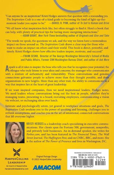 Everyone wants to be the kind of leader who energizes and mobilizes others-yet too few are. Why is it so challenging to crack the code? All it takes is the right conversation...great leaders inspire action with their words. They spark enthusiasm and commitment. With a single conversation, they can change the direction of someone's life. Executive coach Kristi Hedges spent years studying exactly what inspiring leaders do differently. Informed by quantitative research and thousands of responses from leaders at all levels, she reveals that inspiring communication isn't about grand gestures. Instead, those who motivate us most do a few things routinely, consistently, and intentionally. In Inspiration Code, Kristi explains: * Present: investing their attention carefully and guiding the flow of conversations * Personal: speaking genuinely, listening generously, and bringing out the potential of those around the * Passionate: exhibiting sincere emotion and exuding energy attuned to the situation * Purposeful: helping others find meaning and see their place in the bigger picture Eye-opening and accessible, The Inspiration Code dispels common myths about how leaders communicate-and guides them in cultivating qualities that authentically excite. Inspired companies need inspirational leaders. Learn to unlock motivation, lift peoples 'sights, and lead them into the future.