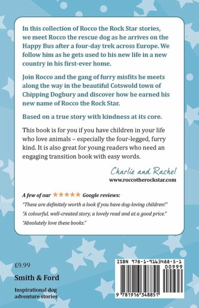 A collection of 3 short adventure stories featuring real life loveable rescue dogs Rocco and Flo and their pawsome pals who will engage and entertain young readers with their antics in the medieval town of Chipping Dogbury. Packed with original, beautiful illustrations and easy vocabulary this fast paced kids book about dogs and outdoor adventures is a great intro in to reading. Fall in love with the canine characters which include a one-eyed Jack Russell, a stinky staffie, a gentleman labrador, a rather aloof but very loyal husky cross as well as two adorable Romanian rescues. All set within a charming Cotswold town with some very interesting and diverse characters living within it. Each of the 3 adventures has a story entwined around a core theme - kindness, patience and courage - and the back page of each story has discussion prompts around that theme. This book is for you if you have children in your life who love animals - especially the four legged, furry kind. It is also great for young readers who need an engaging transition book which is an easy and inspiring read.