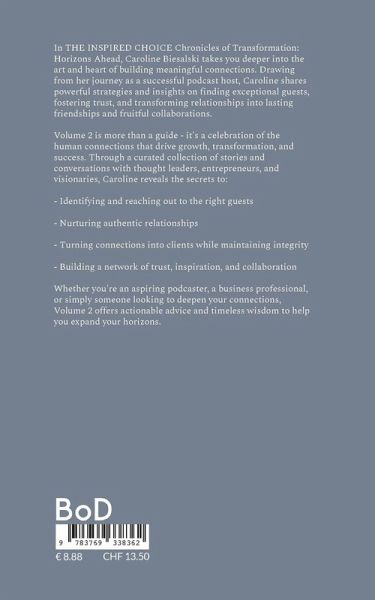 In THE INSPIRED CHOICE Chronicles of Transformation: Horizons Ahead, Caroline Biesalski takes you deeper into the art and heart of building meaningful connections. Drawing from her journey as a successful podcast host, Caroline shares powerful strategies and insights on finding exceptional guests, fostering trust, and transforming relationships into lasting friendships and fruitful collaborations. This volume is more than a guide - it's a celebration of the human connections that drive growth, transformation, and success. Through a curated collection of stories and conversations with thought leaders, entrepreneurs, and visionaries, Caroline reveals the secrets to: - Identifying and reaching out to the right guests for your platform. - Nurturing authentic relationships that go beyond a single conversation. - Turning connections into clients while maintaining integrity and mutual respect. - Building a network of trust, inspiration, and collaboration that lasts a lifetime. Whether you're an aspiring podcaster, a business professional, or simply someone looking to deepen your connections, Volume 2 offers actionable advice and timeless wisdom to help you expand your horizons. Step into THE INSPIRED CHOICE Chronicles of Transformation: Horizons Ahead and discover the power of connection, one meaningful relationship at a time. Your next breakthrough begins with the people you choose to share it with.