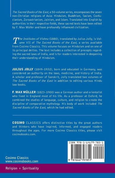 The Sacred Books of the East, a 50-volume series, encompasses the seven non-Christian religions of Asia: Hinduism, Buddhism, Taoism, Confucianism, Zoroastrianism, Jainism, and Islam. Translated into English by authorities in their respective fields, these sacred texts have been edited by F. Max Muller and have profoundly influenced civilization. The Institutes of Vishnu (1880) translated by Julius Jolly, is volume VII of The Sacred Books of the East, a series available from Cosimo Classics. This volume focuses on Hinduism and on one of its principal deities. The text includes a collection of precepts regarding the sacred laws of India, and is for readers interested in deepening their understanding of Hinduism.