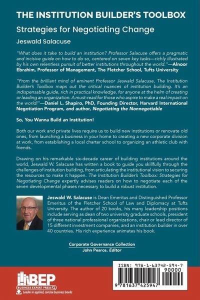 So, You Wanna Build an Institution! Both our work and private lives require us to build new institutions or renovate old ones, from launching a business in your home to creating a new corporate division at work, from establishing a local charter school to organizing an athletic club with friends. Drawing on his remarkable six-decade career of building institutions around the world, Jeswald W. Salacuse has written a book to guide you skillfully through the challenges of institution building, from articulating the institutional vision to securing the resources to make it happen. The Institution Builder's Toolbox: Moves for Negotiating Change expertly advises readers on how to negotiate each of the seven developmental phases necessary to build a robust institution.
