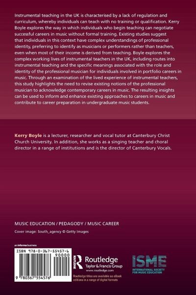 Instrumental teaching in the UK is characterised by a lack of regulation and curriculum, whereby individuals can teach with no training or qualification. Kerry Boyle explores the way in which individuals who begin teaching can negotiate successful careers in music without formal training. Existing studies suggest that individuals in this context have complex understandings of professional identity, preferring to identify as musicians or performers rather than teachers, even when most of their income is derived from teaching. Boyle explores the complex working lives of instrumental teachers in the UK, including routes into instrumental teaching and the specific meanings associated with the role and identity of the professional musician for individuals involved in portfolio careers in music. Through an examination of the lived experience of instrumental teachers, this study highlights the need to revise existing notions of the professional musician to acknowledge contemporary careers in music. The resulting insights can be used to inform and enhance existing approaches to careers in music and contribute to career preparation in undergraduate music students.