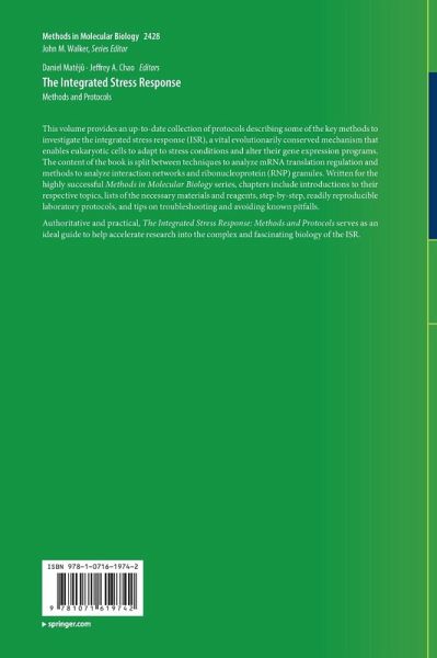 An Overview of Methods for Detecting eIF2 Phosphorylation and the Integrated Stress Response.- CRISPR-Based Screening for Stress Response Factors in Mammalian Cells.- Multiplexed Analysis of Human uORF Regulatory Functions during the ISR Using PoLib-Seq.- Measuring Bulk Translation Activity in Single Mammalian Cells during the Integrated Stress Response.- Quantitative Translation Proteomics Using mePROD.- Quantifying the Binding of Fluorescently Labelled Guanine Nucleotides and Initiator tRNA to Eukaryotic Translation Initiation Factor 2.- Mammalian In VitroTranslation Systems.- Measuring Repeat-Associated Non-AUG (RAN) Translation.- Analysis of Ribosome Profiling Data.- Analysis of Translational Control in the Integrated Stress Response by Polysome Profiling.- High-Resolution Ribosome Profiling for Determining Ribosome Functional States during Translation Elongation.- Fluorescence Intensity-Based eIF2B's Guanine Nucleotide-Exchange Factor Activity Assay.- Collective Learnings of Studies of Stress Granule Assembly and Composition.- Detecting Stress Granules in Drosophila Neurons.- Monitoring and Quantification of the Dynamics of Stress Granule Components in Living Cells by Fluorescence Decay after Photoactivation.- Probing Protein Solubility Patterns with Proteomics for Insight into Network Dynamics.- Analyzing the Composition and Organization of Ribonucleoprotein Complexes by APEX-Seq.- Differential Analysis of the Nuclear and the Cytoplasmic RNA Interactomes in Living Cells.- Identification of RNA-RBP Interactions in Subcellular Compartments by CLIP-Seq.- Monitoring Virus-Induced Stress Granule Dynamics Using Long-Term Live-Cell Imaging.- Single-Molecule Imaging of mRNA Interactions with Stress Granules.- Image-Based Screening for Stress Granule Regulators.- APEX Proximity Labeling of Stress Granule Proteins.