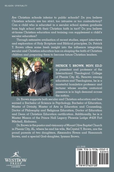 Are Christian schools inferior to public schools? Do you believe Christian schools are too strict, too intrusive or too contradictory? Can a child who is educated in a secular school system graduate from high school with their Christian faith in tact? Do you believe at-home Christian education and training can supplement a childs secular education? Through extensive evaluation of recent studies, expert interviews and exploration of Holy Scripture and Biblical principles, Dr. Patrick T. Brown offers some fresh insight into the influence integrating secular and Christian education has on shaping the faith of Christian children and preparing them to become future Christian leaders.