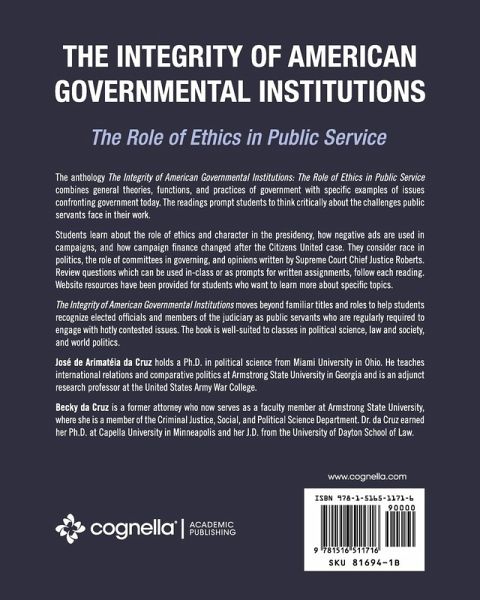 The anthology The Integrity of American Governmental Institutions: The Role of Ethics in Public Service combines general theories, functions, and practices of government with specific examples of issues confronting government today. The readings prompt students to think critically about the challenges public servants face in their work. Students learn about the role of ethics and character in the presidency, how negative ads are used in campaigns, and how campaign finance changed after the Citizens United case. They consider race in politics, the role of committees in governing, and opinions written by Supreme Court Chief Justice Roberts. Review questions which can be used in-class or as prompts for written assignments, follow each reading. Website resources have been provided for students who want to learn more about specific topics. The Integrity of American Governmental Institutions moves beyond familiar titles and roles to help students recognize elected officials and members of the judiciary as public servants who are regularly required to engage with hotly contested issues. The book is well-suited to classes in political science, law and society, and world politics.