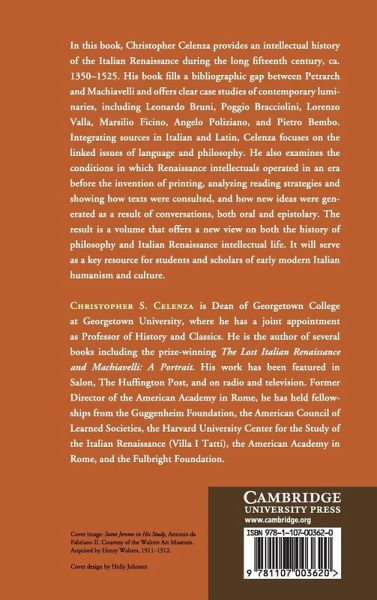 In this book, Christopher Celenza provides an intellectual history of the Italian Renaissance during the long fifteenth century, from c.1350-1525. His book fills a bibliographic gap between Petrarch and Machiavelli and offers clear case studies of contemporary luminaries, including Leonardo Bruni, Poggio Bracciolini, Lorenzo Valla, Marsilio Ficino, Angelo Poliziano, and Pietro Bembo. Integrating sources in Italian and Latin, Celenza focuses on the linked issues of language and philosophy. He also examines the conditions in which Renaissance intellectuals operated in an era before the invention of printing, analyzing reading strategies and showing how texts were consulted, and how new ideas were generated as a result of conversations, both oral and epistolary. The result is a volume that offers a new view on both the history of philosophy and Italian Renaissance intellectual life. It will serve as a key resource for students and scholars of early modern Italian humanism and culture.