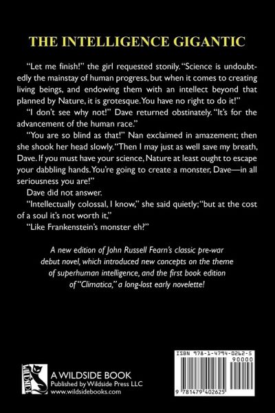 Three scientists proposed to construct a synthetic man, endowed with some five times the intelligence of the ordinary human being. This creature matures quickly, and eventually there steps into being a synthetic man -- "The Intelligence Gigantic." His intellectuality and his occult powers are impressive, but are backed by no humanity, no thought of the happiness of mankind. He has the desire and the power to control the whole world of humanity and to operate the life of the world on principles of arid mechanism and absolute slavery... Presenting John Russell Fearn's classic debut novel, together with an early novelette "Climatica," both of which introduced new concepts to science fiction, including superhuman intelligence and weather control! John Russell Fearn (1908-1960) is noted for such grandly extravagant science fiction as "The Intelligence Gigantic," "The Liners of Time," "Mathematica," and the Golden Amazon series. He was so popular in his day that one of his pseudonyms became the editor of VARGO STATEN'S SCIENCE FICTION MAGAZINE in the 1950s. His work is noted for its vigor amd wild imagination. He has always had a substantial cult following and has been popular in translation around the world.