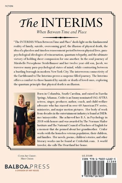 "The INTERIMS: When Between Time and Place" sheds light on the fundamental reality of family, suicide, overcoming grief, the illusion of physical death, the idea of a placeless and timeless reassessment period between physical lives, para-psychological ideologies of reincarnation, quantum telepathy, and the ultimate victory of holding sheer compassion for one another. In the soul journey of Mirabelle Persephone Steidelhauser and her twelve year-old son, Jacob, we traverse many para-psychological states of mind, while contrasting between a bustling borough in modern New York City. The interwoven connectivity of the Earthbound to The Interims proves a suspense filled journey. The Interims offers a comfort to those haunted by suicide or death of loved ones, exploring the quantum principle that physical death is an illusion.