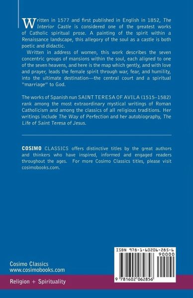 Written in 1577 and first published in English in 1852, The Interior Castle is considered one of the greatest works of Catholic spiritual prose. A painting of the spirit within a Renaissance landscape, this allegory of the soul as a castle is both poetic and didactic. Written in address of women, this work describes the seven concentric groups of mansions within the soul, each aligned to one of the seven heavens, and here is the map which gently, and with love and prayer, leads the female spirit through war, fear, and humility, into the ultimate destination-the central court and a spiritual "marriage" to God. The works of Spanish nun SAINT TERESA OF AVILA (1515-1582) rank among the most extraordinary mystical writings of Roman Catholicism and among the classics of all religious traditions. Her writings include The Way of Perfection and her autobiography, The Life of Saint Teresa of Jesus.