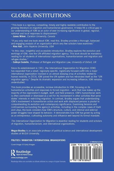 "In this clear, insightful and accessible introduction, Bradley explores the evolution and workings of IOM, now the UN-affiliated migration agency. She reveals that IOM is dependent for most of its funding on earnings as a humanitarian agency in contexts where few people are migrating across borders. While she acknowledges much of the existing critique of IOM for its engagement in the sharp end of migration control on behalf of some states, she also reveals other dimensions of its self-understanding and action. This book should be mandatory reading for all students of international organisations, humanitarianism and migration and refugee studies." - Cathryn Costello, Professor of Refugee and Migration Law, University of Oxford, UK.