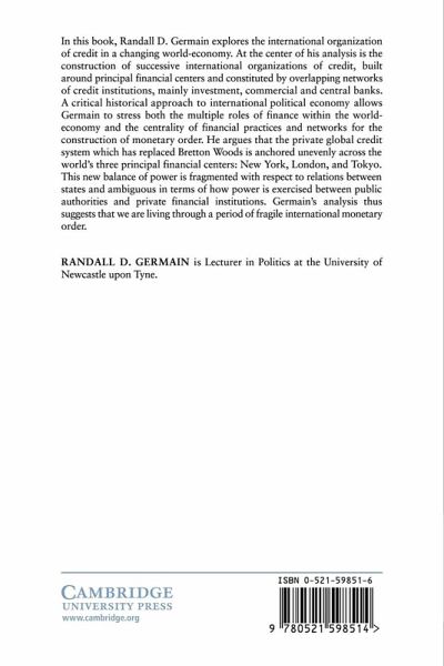 In this book, Randall Germain explores the international organization of credit in a changing world economy. At the centre of his analysis is the construction of successive international organisations of credit, built around principal financial centres (PFCs) and constituted by overlapping networks of credit institutions, mainly investment, commercial, and central banks. A critical historical approach to international political economy (IPE) allows Germain to stress both the multiple roles of finance within the world economy, and the centrality of financial practices and networks for the construction of monetary order. He argues that the private global credit system which replaced Bretton Woods is anchored unevenly across the world's three principal financial centres: New York, London, and Tokyo. This balance of power is irrevocably fragmented with respect to relations between states, and highly ambiguous in terms of how power is exercised between public authorities and private financial institutions.