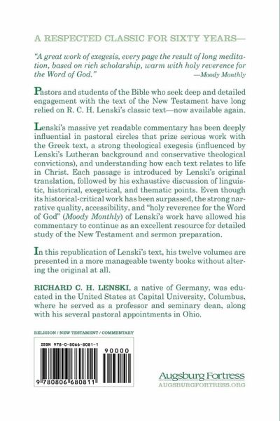 Pastors and students of the Bible who seek deep and detailed engagement with the text of the New Testament have long relied on R. C. H. Lenski's classic text - now available again. Lenski's massive yet readable commentary has been deeply influential in pastoral circles that prize serious work with the Greek text, a strong theological exegesis (influenced by Lenski's Lutheran background and conservative theological convictions), and understanding how each text relates to life in Christ. Each passage is introduced by Lenski's original translation, followed by his exhaustive discussion of linguistic, historical, exegetical, and thematic points. Even though its historical-critical work has been surpassed, the strong narrative quality, accessibility, and "holy reverence for the the Word of God" (Moody Monthly) of Lenski's work have allowed his commentary to continue as an excellent resource for detailed study of the New Testament and sermon preparation. In this republication of Lenski's text, his twelve volumes are presented in a more manageable twenty books without altering the original at all.