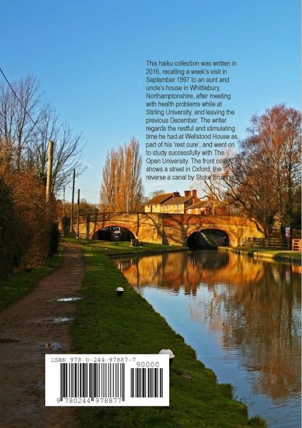 This haiku collection was written in 2016, recalling a week's visit in September 1997 to an aunt and uncle's house in Whittlebury, Northamptonshire, after meeting with health problems while at Stirling University, and leaving the previous December. The writer regards the restful and stimulating time he had at Wellstood House as part of his 'rest cure', and went on to study successfully with The Open University. The front cover shows a street in Oxford, the reverse a canal by Stoke Bruerne.