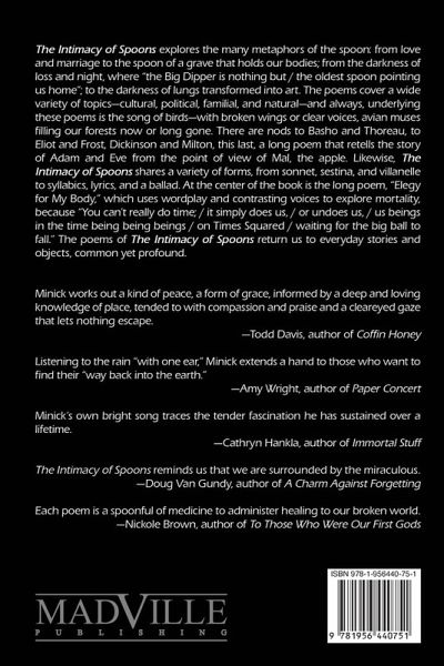 The Intimacy of Spoons explores the many metaphors of the spoon: from love and marriage to the spoon of a grave that holds our bodies; from the darkness of loss and night, where "the Big Dipper is nothing but / the oldest spoon pointing us home"; to the darkness of lungs transformed into art. The poems cover a wide variety of topics-cultural, political, familial, and natural-and always, underlying these poems is the song of birds-with broken wings or clear voices, avian muses filling our forests now or long gone. There are nods to Basho and Thoreau, to Eliot and Frost, Dickinson and Milton, this last, a long poem that retells the story of Adam and Eve from the point of view of Mal, the apple. Likewise, The Intimacy of Spoons shares a variety of forms, from sonnet, sestina, and villanelle to syllabics, lyrics, and a ballad. At the center of the book is the long poem, "Elegy for My Body," which uses wordplay and contrasting voices to explore mortality, because "You can't really do time; / it simply does us, / or undoes us, / us beings in the time being being beings / on Times Squared / waiting for the big ball to fall." The poems of The Intimacy of Spoons return us to everyday stories and objects, common yet profound, that we touch so often and that enter us with every meal and every breath.