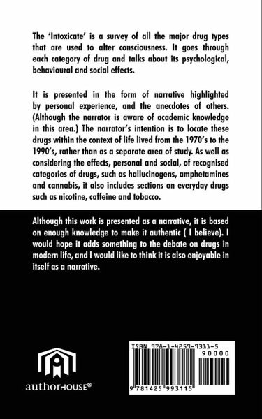 The 'Intoxicate' is a survey of all the major drug types that are used to alter consciousness. It goes through each category of drug and talks about its psychological, behavioural and social effects. It is presented in the form of narrative highlighted by personal experience, and the anecdotes of others. ( Although the narrator is aware of academic knowledge in this area.) The narrator's intention is to locate these drugs within the context of life lived from the 1970's to the 1990's, rather than as a separate area of study. As well as considering the effects, personal and social, of recognised categories of drugs, such as hallucinogens, amphetamines and cannabis, it also includes sections on everyday drugs such as nicotine, caffeine and tobacco. Although this work is presented as a narrative, it is based on enough knowledge to make it authentic ( I believe). I would hope it adds something to the debate on drugs in modern life, and I would like to think it is also enjoyable in itself as a narrative.