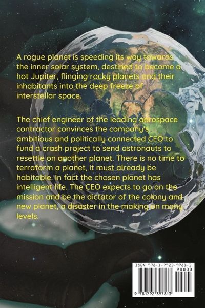 A rogue planet is speeding its way towards the inner solar system, destined to become a hot Jupiter. It is a scenario that has played out countless times throughout the galaxy, and the result is always that the rocky inner planets are flung into the deep freeze of interstellar space, taking their inhabitants with them. The people in the story are compelled by their character, culture, history, and beliefs to choose a particular path and they have little conscious choice in the matter. Moral and spiritual dilemmas, and emotional conflicts abound. The chief engineer of the leading aerospace contractor convinces the company's CEO to fund a crash project to send astronauts to resettle on another planet. It is imperative to choose a planet that is proven to be habitable, that is, with life already established. There is no time to terraform another planet and in addition, such large engineering efforts are uncertain, difficult to fine tune, and prone to unanticipated runaway effects. A hand-picked team of astronauts and the exploration project engineering team have a tight, unalterable deadline to design, adapt, test, prepare for and launch new space habitats toward their exoplanet targets before the inevitable panic destroys their facilities and resources. Robots and artificial intelligence must play a key role, enhanced and extended well beyond current capabilities. This technology has its own dangers and limitations. Is success even possible? As catastrophe nears, people's motivations change. Work, education, and careers offer fewer incentives while family becomes more important. Law and order gradually break down. Government leaders react to both the emergency and people's response to it. Demagogues and cult leaders spring up right and left with appealing messages for the desperate and susceptible. Society is forcibly altered.