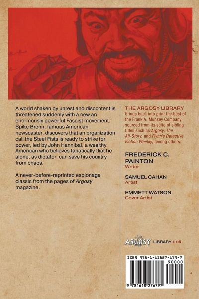 A world shaken by unrest and discontent is threatened suddenly with a new an enormously powerful Fascist movement. Spike Brenn, famous American newscaster, discovers that an organization call the Steel Fists is ready to strike for power, led by John Hannibal, a wealthy American who believes fanatically that he alone, as dictator, can save his country from chaos. A never-before-reprinted espionage classic from the pages of Argosy magazine.