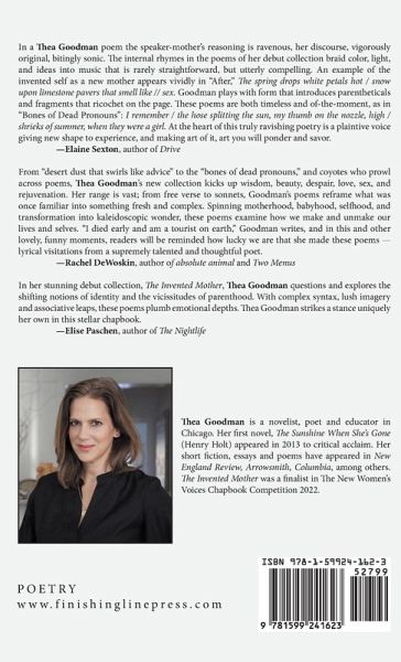 Thea Goodman is a novelist, poet and educator in Chicago. Her first novel, The Sunshine When She's Gone (Henry Holt) appeared in 2013 to critical acclaim. Her short fiction, essays and poems have appeared in New England Review, Arrowsmith, Columbia, among others. The Invented Mother was a finalist in The New Women's Voices Chapbook Competition 2022.