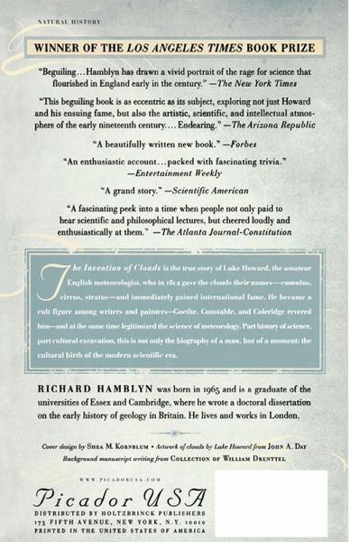 Winner of the Los Angeles Times Book Prize The early years of the nineteenth century saw an intriguing yet little-known scientific advance catapult a shy young Quaker to the dizzy heights of fame. The Invention of Clouds tells the extraordinary story of an amateur meteorologist, Luke Howard, and his groundbreaking work to define what had hitherto been random and unknowable structures-clouds. In December 1802, Luke Howard delivered a lecture that was to be a defining point in natural history and meteorology. He named the clouds, classifying them in terms that remain familiar to this day: cirrus, stratus, cumulus, and nimbus. This new and precise nomenclature sparked worldwide interest and captured the imaginations of some of the century's greatest figures in the fields of art, literature, and science. Goethe, Constable, and Coleridge were among those who came to revere Howard's vision of an aerial landscape. Legitimized by the elevation of this new classification and nomenclature, meteorology fast became a respectable science. Although his work is still the basis of modern meteorology, Luke Howard himself has long been overlooked. Part history of science, part cultural excavation, The Invention of Clouds is a detailed and informative examination of Howard's life and achievements and introduces a new audience to the language of the skies.