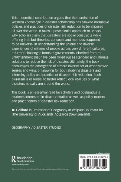 This theoretical contribution argues that the domination of Western knowledge in disaster scholarship has allowed normative policies and practices of disaster risk reduction to be imposed all over the world. It takes a postcolonial approach to unpack why scholars claim that disasters are social constructs while offering little but theories, concepts and methods supposed to be universal in understanding the unique and diverse experiences of millions of people across very different cultures. It further challenges forms of governments inherited from the Enlightenment that have been rolled out as standard and ultimate solutions to reduce the risk of disaster. Ultimately, the book encourages the emergence of a more diverse set of world views/senses and ways of knowing for both studying disasters and informing policy and practice of disaster risk reduction. Such pluralism is essential to better reflect local realities of what disasters actually are around the world.