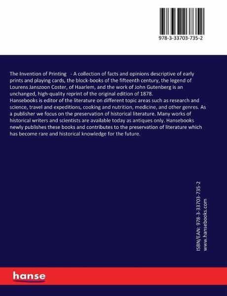 The Invention of Printing - A collection of facts and opinions descriptive of early prints and playing cards, the block-books of the fifteenth century, the legend of Lourens Janszoon Coster, of Haarlem, and the work of John Gutenberg is an unchanged, high-quality reprint of the original edition of 1878.
