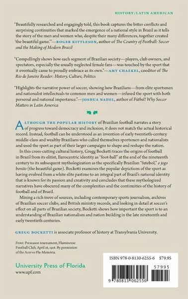 In this cross-cutting cultural history, Gregg Bocketti traces the origins of soccer in Brazil from its elitist, Eurocentric identity as “football” at the end of the nineteenth century to its subsequent mythologization as the specifically Brazilian “futebol,” o jogo bonito (the beautiful game). Bocketti examines the sport and its narratives, which usually depict soccer as having evolved from a white elite pastime to an integral part of Brazil’s national identity known for its passion and creativity, and explains the ways that the popular history of the game has obscured many of the complexities and the continuities of the history of soccer and of Brazil. Mining a rich trove of sources, including contemporary sports journalism, archives of Brazilian soccer clubs, and British ministry records, and looking in detail at soccer’s effect on all parts of Brazilian society, Bocketti shows how important the sport is to an understanding of Brazilian nationalism and nation building in the late nineteenth and early twentieth centuries.