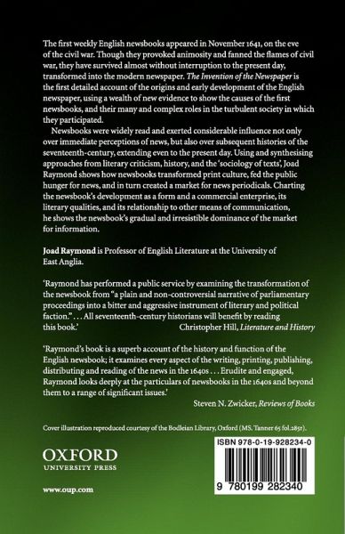 The first weekly English newsbooks appeared in November 1641, on the eve of the civil war. Though they provoked animosity and fanned the flames of civil war, they have survived almost without interruption to the present day, transformed into the modern newspaper. The Invention of the Newspaper is the first detailed account of the origins and early development of the English newspaper, using a wealth of new evidence to show the causes of the first newsbooks, and their many and complex roles in the turbulent society in which they participated. Newsbooks were widely read and exerted considerable influence not only over immediate perceptions of news, but also over subsequent histories of the seventeenth-century, extending even to the present day. Using and synthesising approaches from literary criticism, history, and the 'socoiology of texts', The Invention of the Newspaper shows how newsbooks transformed print culture, fed the public hunger for news, and in turn created a market for news periodical. Charting the newsbook's development as a form and a commercial enterprise, its literary qualities, and its relationship to other means of communication, The Invention of the Newspaper shows the newsbook's gradual and irresistible dominance of the market for information.