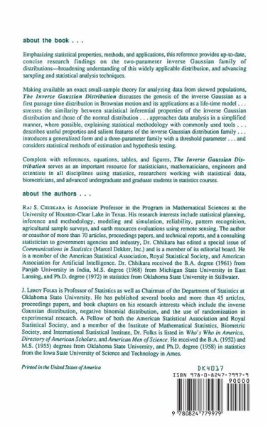 This monograph is a compilation of research on the inverse Gaussian distribution. It emphasizes the presentation of the statistical properties, methods, and applications of the two-parameter inverse Gaussian family of distribution. It is useful to statisticians and users of statistical distribution.