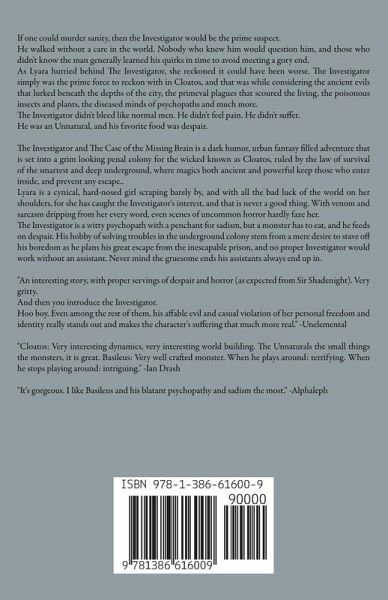 If one could murder sanity, then the Investigator would be the prime suspect. He walked without a care in the world. Nobody who knew him would question him, and those who didn't know the man generally learned his quirks in time to avoid meeting a gory end. As Lyara hurried behind The Investigator, she reckoned it could have been worse. The Investigator simply was the prime force to reckon with in Cloatos, and that was while considering the ancient evils that lurked beneath the depths of the city, the primeval plagues that scoured the living, the poisonous insects and plants, the diseased minds of psychopaths and much more. The Investigator didn't bleed like normal men. He didn't feel pain. He didn't suffer. He was an Unnatural, and his favorite food was despair. The Investigator and The Case of the Missing Brain is a dark humor, urban fantasy filled adventure that is set into a grim looking penal colony for the wicked known as Cloatos, ruled by the law of survival of the smartest and deep underground, where magics both ancient and powerful keep those who enter inside, and prevent any escape.. Lyara is a cynical, hard-nosed girl scraping barely by, and with all the bad luck of the world on her shoulders, for she has caught the Investigator's interest, and that is never a good thing. With venom and sarcasm dripping from her every word, even scenes of uncommon horror hardly faze her. The Investigator is a witty psychopath with a penchant for sadism, but a monster has to eat, and he feeds on despair. His hobby of solving troubles in the underground colony stem from a mere desire to stave off his boredom as he plans his great escape from the inescapable prison, and no proper Investigator would work without an assistant. Never mind the gruesome ends his assistants always end up in. "An interesting story, with proper servings of despair and horror (as expected from Sir Shadenight). Very gritty. And then you introduce the Investigator. Hoo boy. Even among the rest of them, his affable evil and casual violation of her personal freedom and identity really stands out and makes the character's suffering that much more real." -Unelemental "Cloatos: Very interesting dynamics, very interesting world building. The Unnaturals the small things the monsters, it is great. Basileus: Very well crafted monster. When he plays around: terrifying. When he stops playing around: intriguing." -Ian Drash "It's gorgeous. I like Basileus and his blatant psychopathy and sadism the most." -Alphaleph
