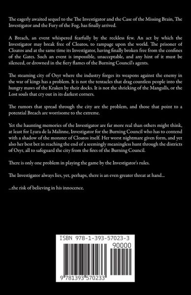 The eagerly awaited sequel to the The Investigator and the Case of the Missing Brain, The Investigator and the Fury of the Fog, has finally arrived. A Breach, an event whispered fearfully by the reckless few. An act by which the Investigator may break free of Cloatos, to rampage upon the world. The prisoner of Cloatos and at the same time its Investigator, having finally broken free from the confines of the Gates. Such an event is impossible, unacceptable, and any hint of it must be silenced, or drowned in the fiery flames of the Burning Council's agents. The steaming city of Osyr where the industry forges its weapons against the enemy in the war of kings has a problem. It is not the tentacles that drag countless people into the hungry maws of the Kraken by their docks. It is not the shrieking of the Mangulls, or the Lost souls that cry out in its darkest corners. The rumors that spread through the city are the problem, and those that point to a potential Breach are worrisome to the extreme. Yet the haunting memories of the Investigator are far more real than others might think, at least for Lyara de la Malinne, Investigator for the Burning Council who has to contend with a shadow of the monster of Cloatos itself. Her worst nightmare given form, and yet also her best bet in reaching the end of a seemingly meaningless hunt through the districts of Osyr, all to safeguard the city from the fires of the Burning Council. There is only one problem in playing the game by the Investigator's rules. The Investigator always lies, yet, perhaps, there is an even greater threat at hand... ...the risk of believing in his innocence.