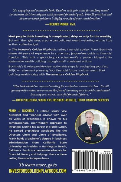 Finalist for The IAN Book of the Year Awards 2025From Novice to Confident Investor, Follow The 12 Golden Rules to Simplify Investing and Secure Your Financial Future Most people believe investing is complicated, risky, or only for the wealthy. But with the right rules and a clear strategy, anyone can build real wealth-starting with as little as their daily coffee budget. In The Investor's Golden Playbook: 12 Rules for Achieving Real Wealth, retired financial advisor Frank Buchholz distills 40 years of real-world experience into a practical, jargon-free guide to securing financial freedom. This is not a get-rich-quick scheme-it's a proven blueprint for sustainable wealth building through smart, consistent investing. With relatable client stories and actionable insights, Buchholz shows you how small, consistent actions can lead to big results. What you'll learn: How to build wealth steadily, even starting small, with proven strategies like the Starbucks Savings Plan. Why the stock market remains the best long-term investment vehicle-and how to navigate its ups and downs. How to create a money buffer, diversify investments, and plan for retirement in a way that ensures peace of mind. The "Get Rich Slow" approach that prioritizes long-term financial success over quick fixes, and the sound financial habits that will get you there. How to build a trusted relationship with an ethical financial advisor, including understanding fees and commissions and using tools like FINRA's BrokerCheck. With The Investor's Golden Playbook, gain the 12 rules that can lead to consistent, long-term financial success, even for inexperienced investors. Whether you're navigating your first 401(k) or preparing for retirement, Buchholz's simple approach is rooted in realism and empowers investors through knowledge. Your financial future is yours to control. Start with The Investor's Golden Playbook and build your wealth with confidence.