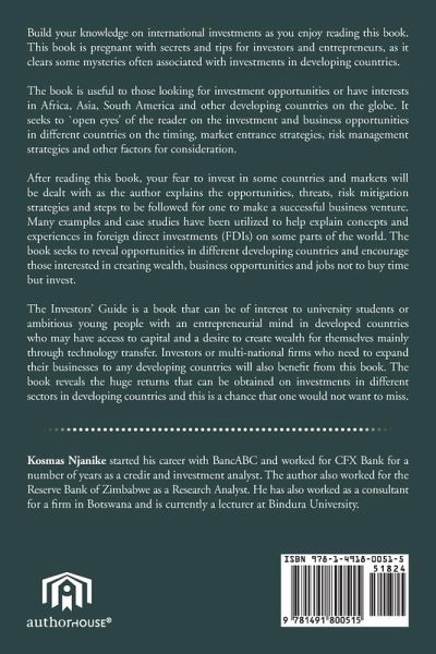 Build your knowledge on international investments as you enjoy reading this book. This book is pregnant with secrets and tips for investors and entrepreneurs, as it clears some mysteries often associated with investments in developing countries. The book is useful to those looking for investment opportunities or has interests in Africa, Asia, South America and other developing countries on the globe. It seeks to `open eyes' of the reader on the investment and business opportunities in different countries on the timing, market entrance strategies, risk management strategies and other factors for considerations. After reading this book your fear to invest in some countries and markets will be dealt with as the author explains the opportunities, threats, risk mitigation strategies and steps to be followed for one to make a successful business venture. Many examples and case studies have been utilized to help explain concepts and experiences in foreign direct investments (FDIs) on some parts of the world. The book sought to reveal opportunities in different developing countries and encourage those interested in creating wealth, business opportunities and jobs not to buy time but invest. The Investors' Guide is a book that can be of interest to university students or ambitious young people with an entrepreneurial mind in developed countries who may have access to capital and a desire to create wealth for themselves mainly through technology transfer. Investors or multi-national firms who need to expand their businesses to any developing countries will also benefit from this book. The book reveals the huge returns that can be obtained on investments in different sectors in developing countries and this is a chance that one would not want to miss.