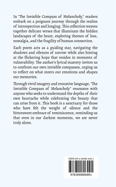 In "The Invisible Compass of Melancholy," readers embark on a poignant journey through the realms of introspection and longing. This collection weaves together delicate verses that illuminate the hidden landscapes of the heart, exploring themes of loss, nostalgia, and the fragility of human connection. Each poem acts as a guiding star, navigating the shadows and silences of sorrow while also hinting at the flickering hope that resides in moments of vulnerability. The author's lyrical mastery invites us to confront our own invisible compasses, urging us to reflect on what steers our emotions and shapes our memories. Through vivid imagery and evocative language, "The Invisible Compass of Melancholy" resonates with anyone who seeks to understand the depths of their own heartache while celebrating the beauty that can arise from it. This book is a sanctuary for those who have felt the weight of silence and the bittersweet embrace of reminiscence, reminding us that even in our darkest moments, we are never truly alone.