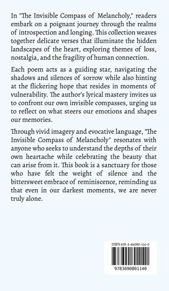 In "The Invisible Compass of Melancholy," readers embark on a poignant journey through the realms of introspection and longing. This collection weaves together delicate verses that illuminate the hidden landscapes of the heart, exploring themes of loss, nostalgia, and the fragility of human connection. Each poem acts as a guiding star, navigating the shadows and silences of sorrow while also hinting at the flickering hope that resides in moments of vulnerability. The author's lyrical mastery invites us to confront our own invisible compasses, urging us to reflect on what steers our emotions and shapes our memories. Through vivid imagery and evocative language, "The Invisible Compass of Melancholy" resonates with anyone who seeks to understand the depths of their own heartache while celebrating the beauty that can arise from it. This book is a sanctuary for those who have felt the weight of silence and the bittersweet embrace of reminiscence, reminding us that even in our darkest moments, we are never truly alone.