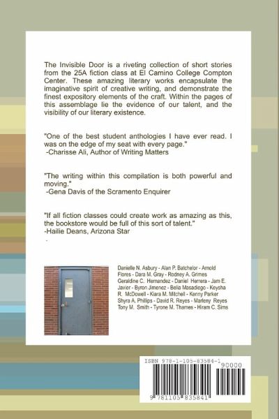 The Invisible Door is a riveting collection of short stories from the 25A fiction class at El Camino College Compton Center. These amazing literary works encapsulate the imaginative spirit of creative writing, and demonstrate the finest expository elements of the craft. Within the pages of this assemblage lie the evidence of our talent, and the visibility of our literary existence.