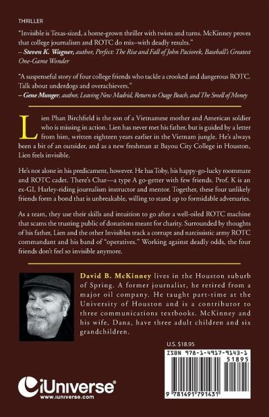Lien Phan Birchfield is the son of a Vietnamese mother and American soldier who is missing in action. Lien has never met his father, but is guided by a letter from him, written eighteen years earlier in the Vietnam jungle. He's always been a bit of an outsider, and as a new freshman at Bayou City College in Houston, Lien feels invisible. He's not alone in his predicament, however. He has Toby, his happy-go-lucky roommate and ROTC cadet. There's Char-a type A go-getter with few friends. Prof. K is an ex-GI, Harley-riding journalism instructor and mentor. Together, these four unlikely friends form a bond that is unbreakable, willing to stand up to formidable adversaries. As a team, they use their skills and intuition to go after a well-oiled ROTC machine that scams the trusting public of donations meant for charity. Surrounded by thoughts of his father, Lien and the other Invisibles track a corrupt and narcissistic army ROTC commandant and his band of "operatives." Working against deadly odds, the four friends don't feel so invisible anymore.