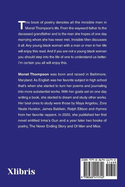This book of poetry denotes all the invisible men in Monet Thompson's life. From the wayward father to the deceased grandfather and to the man she hopes of one day marrying whom she has never met, Invisible Men discusses it all. Any young black woman with a man or men in her life will enjoy this read. And if you are not a young black woman you should step into the life of one to understand us better. I'm certain you all will enjoy this.