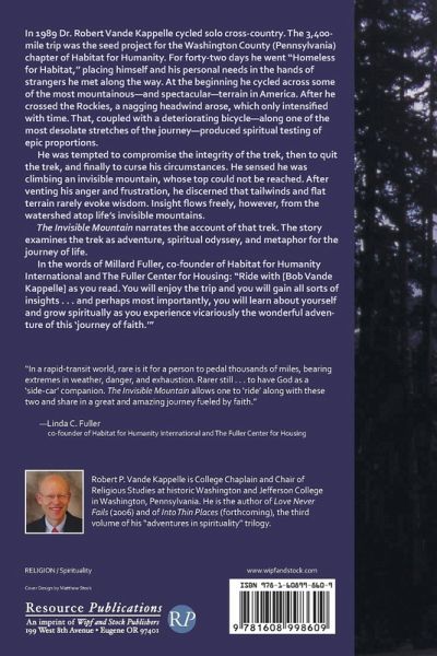 In 1989 Dr. Robert Vande Kappelle cycled solo cross-country. The 3,400-mile trip was the seed project for the Washington County (Pennsylvania) chapter of Habitat for Humanity. For forty-two days he went ""Homeless for Habitat,"" placing himself and his personal needs in the hands of strangers he met along the way. At the beginning he cycled across some of the most mountainous--and spectacular--terrain in America. After he crossed the Rockies, a nagging headwind arose, which only intensified with time. That, coupled with a deteriorating bicycle--along one of the most desolate stretches of the journey--produced spiritual testing of epic proportions. He was tempted to compromise the integrity of the trek, then to quit the trek, and finally to curse his circumstances. He sensed he was climbing an invisible mountain, whose top could not be reached. After venting his anger and frustration, he discerned that tailwinds and flat terrain rarely evoke wisdom. Insight flows freely, however, from the watershed atop life's invisible mountains. The Invisible Mountain narrates the account of that trek. The story examines the trek as adventure, spiritual odyssey, and as metaphor for the journey of life. In the words of Millard Fuller, co-founder of Habitat for Humanity International and The Fuller Center for Housing: ""Ride with [Bob Vande Kappelle] as you read. You will enjoy the trip and you will gain all sorts of insights . . . and perhaps most importantly, you will learn about yourself and grow spiritually as you experience vicariously the wonderful adventure of this 'journey of faith.'""