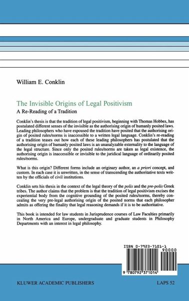 Conklin's thesis is that the tradition of modern legal positivism, beginning with Thomas Hobbes, postulated different senses of the invisible as the authorising origin of humanly posited laws. Conklin re-reads the tradition by privileging how the canons share a particular understanding of legal language as written. Leading philosophers who have espoused the tenets of the tradition have assumed that legal language is written and that the authorising origin of humanly posited rules/norms is inaccessible to the written legal language. Conklin's re-reading of the tradition teases out how each of these leading philosophers has postulated that the authorising origin of humanly posited laws is an unanalysable externality to the written language of the legal structure. As such, the authorising origin of posited rules/norms is inaccessible or invisible to their written language. What is this authorising origin? Different forms include an originary author, an a priori concept, and an immediacy of bonding between person and laws. In each case the origin is unwritten in the sense of being inaccessible to the authoritative texts written by the officials of civil institutions of the sovereign state. Conklin sets his thesis in the context of the legal theory of the polis and the pre-polis of Greek tribes. The author claims that the problem is that the tradition of legal positivism of a modern sovereign state excises the experiential, or bodily, meanings from the written language of the posited rules/norms, thereby forgetting the very pre-legal authorising origin of the posited norms that each philosopher admits as offering the finality that legal reasoning demands if it is to be authoritative.