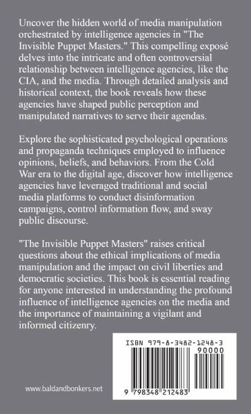 Uncover the hidden world of media manipulation orchestrated by intelligence agencies in "The Invisible Puppet Masters." This compelling exposé delves into the intricate and often controversial relationship between intelligence agencies, like the CIA, and the media. Through detailed analysis and historical context, the book reveals how these agencies have shaped public perception and manipulated narratives to serve their agendas. Explore the sophisticated psychological operations and propaganda techniques employed to influence opinions, beliefs, and behaviors. From the Cold War era to the digital age, discover how intelligence agencies have leveraged traditional and social media platforms to conduct disinformation campaigns, control information flow, and sway public discourse. "The Invisible Puppet Masters" raises critical questions about the ethical implications of media manipulation and the impact on civil liberties and democratic societies. This book is essential reading for anyone interested in understanding the profound influence of intelligence agencies on the media and the importance of maintaining a vigilant and informed citizenry.