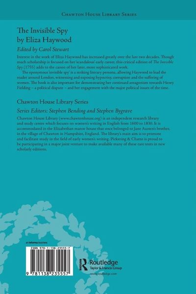 Interest in the work of Eliza Haywood has increased greatly over the last two decades. Though much scholarship is focused on her 'scandalous' early career, this critical edition of The Invisible Spy (1755) adds to the canon of her later, more sophisticated work.