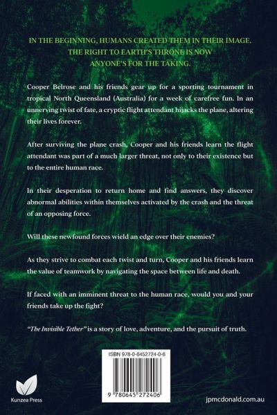 Cooper Belrose and his friends gear up for a sporting tournament in tropical North Queensland (Australia) for a week of carefree fun. In an unnerving twist of fate, a cryptic flight attendant hijacks the plane, altering their lives forever. After surviving the plane crash, Cooper and his friends learn the flight attendant was part of a much larger threat, not only to their existence but to the entire human race. In their desperation to return home and find answers, they discover abnormal abilities within themselves activated by the crash and the threat of an opposing force. Will these newfound abilities wield an edge over their enemies? As they strive to combat each twist and turn, Cooper and his friends learn the value of teamwork by navigating the space between life and death. If faced with an imminent threat to the human race, would you and your friends take up the fight? "The Invisible Tether," is a story of love, adventure and the pursuit of truth.
