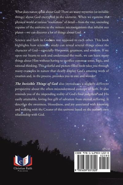 What does nature speak about God? There are many mysteries (or invisible things) about God encrypted in the universe. When we examine the physical world at various "resolutions" of detail--from the vast, unending expanse of the universe to the minute microorganisms that inhabit our planet--we can discover a lot of things about God. Science and faith in God are not opposed to each other. This book highlights how scientific study can reveal several things about the character of God--especially His power, greatness, and wisdom. If we open our hearts to seek and understand the truth, we can learn many things about Him without having to sacrifice common sense, logic, and rational thinking. This colorful and picture-filled book takes you through many examples in nature that clearly display God's amazing work of creation and, in the process, provokes you to awe and wonder! The Invisible Things of God also introduces a slightly different perspective about the often-misunderstood concept of faith. It also reminds you of the impending reality of God's final judgment and His easily attainable, loving free gift of salvation from eternal suffering. It describes the sweetness, blessedness, and joy associated with knowing and walking with the Creator of this universe based on the author's own relationship with God.