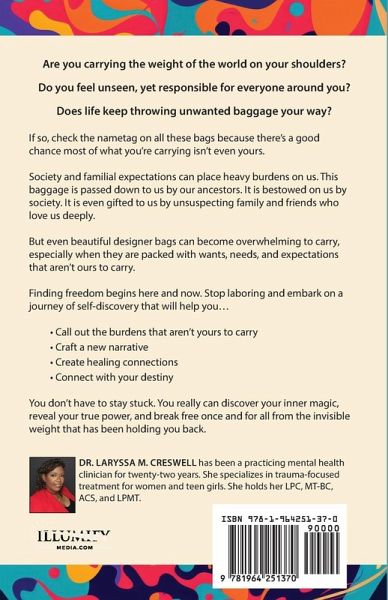 Are you carrying the weight of the world on your shoulders? Do you feel unseen, yet responsible for everyone around you? Does life keep throwing unwanted baggage your way? If so, check the nametag on all these bags because there's a good chance most of what you're carrying isn't even yours. Society and familial expectations can place heavy burdens on us. This baggage is passed down to us by our ancestors. It is bestowed on us by society. It is even gifted to us by unsuspecting family and friends who love us deeply. But even beautiful designer bags can become overwhelming to carry, especially when they are packed with wants, needs, and expectations that aren't ours to carry. Finding freedom begins here and now. Stop laboring and embark on a journey of self-discovery that will help you...Call out the burdens that aren't yours to carry Craft a new narrative Create healing connections Connect with your destiny You don't have to stay stuck. You really can discover your inner magic, reveal your true power, and break free once and for all from the invisible weight that has been holding you back.