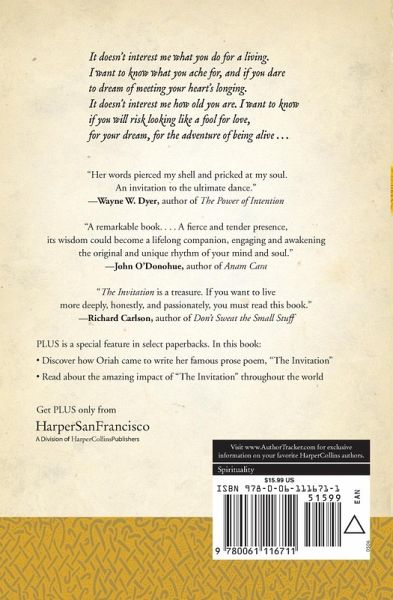 Shared by word of mouth, e-mailed from reader to reader, recited over the radio, and read aloud at thousands of retreats and conferences, "The Invitation" has changed the lives of people everywhere. In this bestselling book, Oriah expands on the wisdom found within her beloved prose poem, which presents a powerful challenge to all who long to live an authentic life. In a world of endless small talk, constant traffic jams, and overburdened schedules, "The Invitation" opens the door to a new way of life -- a way of intimacy, honesty, and peace with ourselves, others, and the world around us. Oriah invites us to embrace the varieties of human experience, from desire and commitment to sorrow and betrayal, and to open ourselves to all that is possible. The Invitation is an invaluable guide to overcoming the obstacles that stand in our way and to discovering the true beauty that life has to offer. Accept the invitation and open yourself to a more meaningful life.