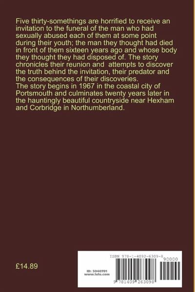 Five thirty-somethings are horrified to receive an invitation to the funeral of the man who sexually abused them all at some point in their youth; the man they thought had died in front of them sixteen years ago. The story chronicles their attempts to discover the reason behind the invitation, the truth about his death and the consequences of their discoveries. This story spans from 1967 through to 1987, beginning in the coastal city of Portsmouth and culminating in the hauntingly beautiful cointryside around Corbridge and Hexham in Northumberland.