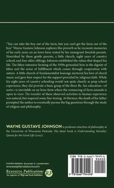 ""You can take the boy out of the farm, but you can't get the farm out of the boy."" Wayne Gustave Johnson explores this proverb as he recounts memories of his early years on an Iowa farm rented by his immigrant Swedish parents. Nourished by these gentle parents, a little church, eight years of country school, and four older siblings, Johnson established the values that shaped his life. The labor-intensive farming of the 1930s grounded him in the dignity of labor and the sense of fulfillment which comes through cooperation with nature. A little church of fundamentalist leanings nurtured his love of choral music and gave him respect for the support provided by religious faith. While his eight years of country schooling would not quite classify as prep school experience, they did provide a basic grasp of the three Rs. Sex education--of sorts--is inevitable on an Iowa farm where the romancing of farm animals is open to view. The transfer of these observed activities to human experience was natural, but required some fine-tuning. At thirteen, the death of his father prompted the author to eventually pursue the big questions through the study of religion and philosophy.