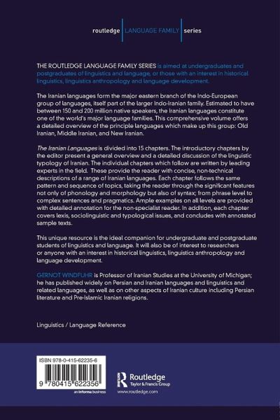 The Iranian languages form the major eastern branch of the Indo-European group of languages, itself part of the larger Indo-Iranian family. Estimated to have between 150 and 200 million native speakers, the Iranian languages constitute one of the world's major language families. This comprehensive volume offers a detailed overview of the principle languages which make up this group: Old Iranian, Middle Iranian, and New Iranian. The Iranian Languages is divided into fifteen chapters. The introductory chapters by the editor present a general overview and a detailed discussion of the linguistic typology of Iranian. The individual chapters which follow are written by leading experts in the field. These provide the reader with concise, non-technical descriptions of a range of Iranian languages. Each chapter follows the same pattern and sequence of topics, taking the reader through the significant features not only of phonology and morphology but also of syntax; from phrase level to complex sentences and pragmatics. Ample examples on all levels are provided with detailed annotation for the non-specialist reader. In addition, each chapter covers lexis, sociolinguistic and typological issues, and concludes with annotated sample texts. This unique resource is the ideal companion for undergraduate and postgraduate students of linguistics and language. It will also be of interest to researchers or anyone with an interest in historical linguistics, linguistics anthropology and language development. Gernot Windfuhr is Professor of Iranian Studies at the University of Michigan; he has published widely on Persian and Iranian languages and linguistics and related languages, as well as on other aspects of Iranian culture including Persian literature and Pre-Islamic Iranian religions.
